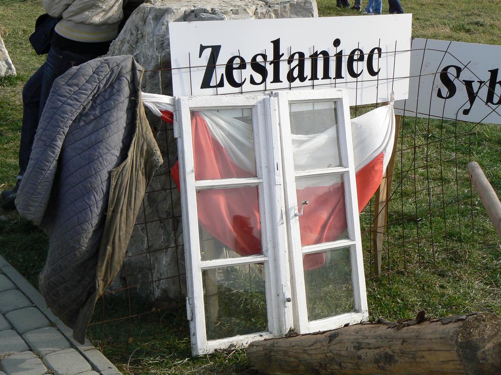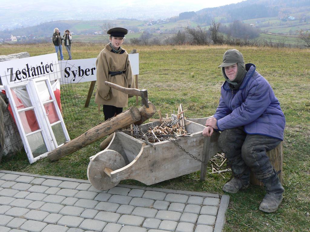 · Zesłańca Syberyjskiego przykutego łańcuchem do taczki. Sybiraka pilnował żołnierz rosyjski, a w dali za oknem – symbolem nadziei, powiewała biało czerwona flaga, która pozwalała na przetrwanie na ,,nieludzkiej ziemi” Taczka wypełniona była krzyżykami własnoręcznie wykonanymi przez uczniów naszego powiatu. Chodziło bowiem o to, by młodzi twórcy wczuli się w realia tamtych czasów. Podczas uroczystości krzyże te zostały poświęcone przez Ks. Biskupa i uczestnicy uroczystości mogli zabrać je do domu