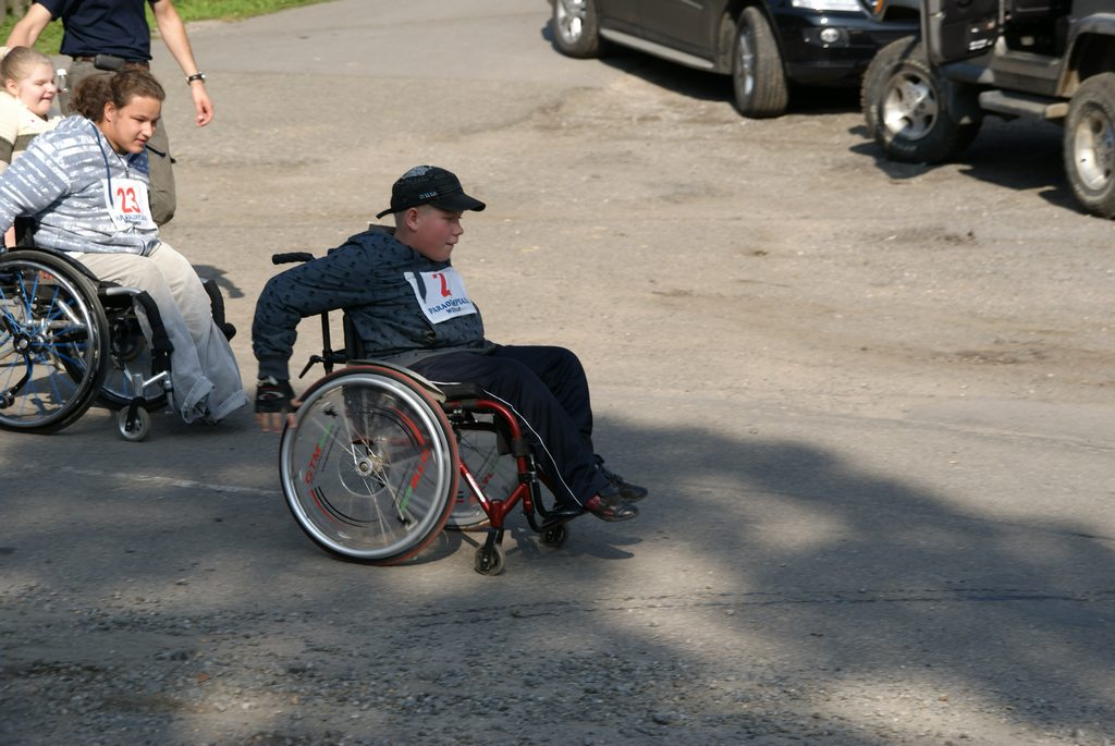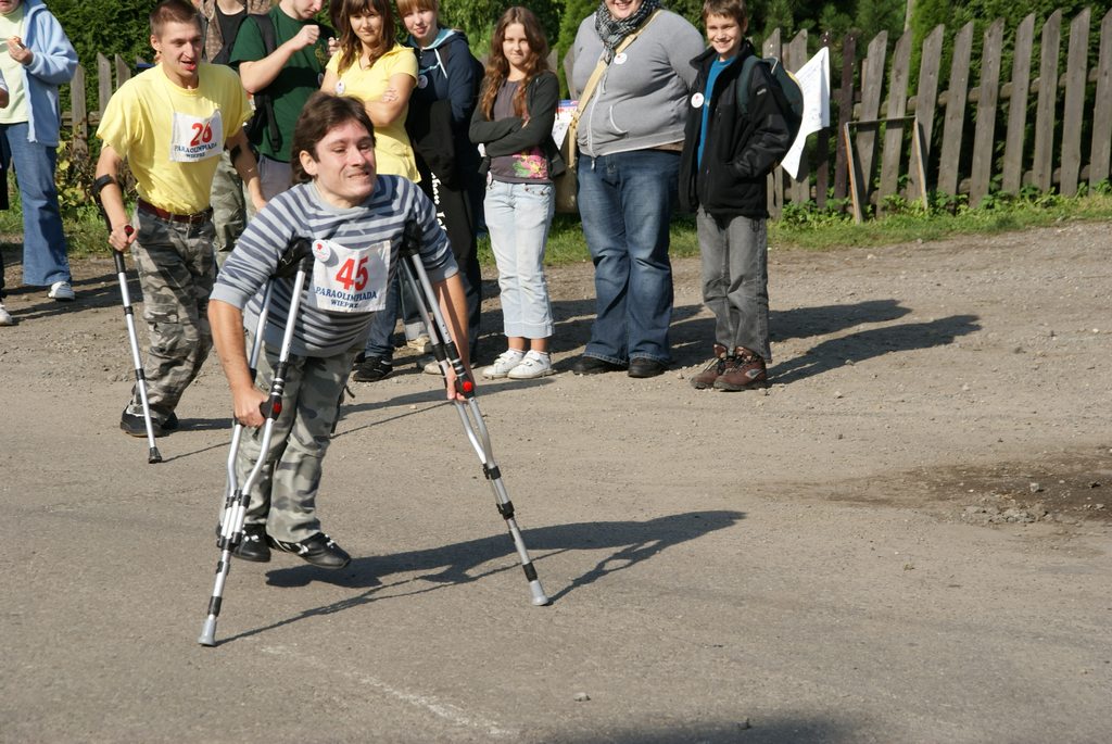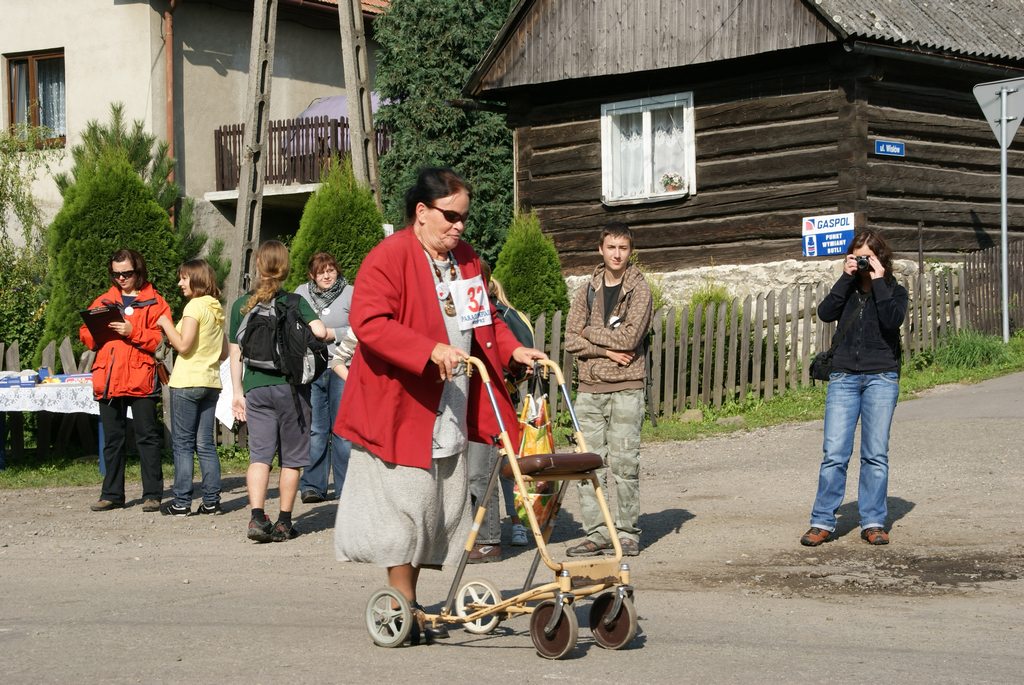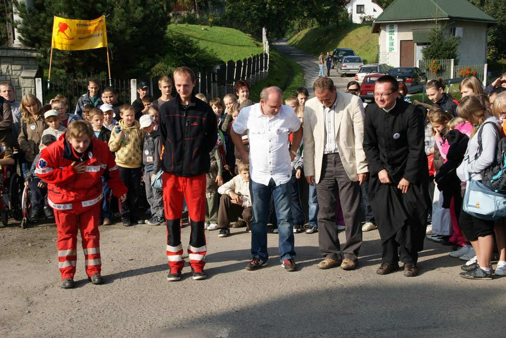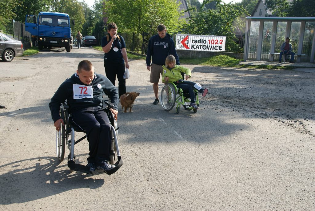 Podczas gdy uczestnicy czerwonego szlaku oczekiwali na swój wymarsz, na placu zbiórki rozegrano pierwszą część VI Wojewódzkich Wyścigów Wózków Nieprofesjonalnych oraz Osób z Dysfunkcją Narządu Ruch. Tutaj jak zaznaczył prowadzący wyścigi, dzieci – tego dnia nie mające ochoty na jakikolwiek wysiłek, były przewożone przez osobę z zawiązanymi oczami, a widzowie kierowali jego krokami mówiąc ,,ciepło, lub zimno” tak by ten omijając przeszkody dotarł do mety. W ten sposób bawiono się doskonale. Potem przyszła kolej na osoby, które w niewielkim stopniu potrafią dłońmi poruszać wózek, ale i w tym przypadku Edyta i Konrad zebrali ogromne brawa. Duet Krzysiu z Bystrej Krakowskiej i Joanna z Gliwic zawojował serca widzów. Kolejno jeszcze wystąpili: Asia, Kamil i Sebastian, tutaj prędkości wózków były zawrotne i sędziowie dopuścili Sebastiana i Kamila do Biegu Głównego. Asia natomiast w konkurencji pań zajęła I miejsce. O kulach startowali: Szymon i Darek, jednak ich sposoby pokonywania wyznaczonego odcinka zasadniczo różniły się, więc sędziowie ogłosili remis. Na koniec wystartowała pani Inga, która tradycyjnie już od VI lat pokonuje trasę przy pomocy balkonika. Należy tu dodać, że kiedy otrzymała złoty medal, to z ogromnym namaszczeniem go ucałowała.