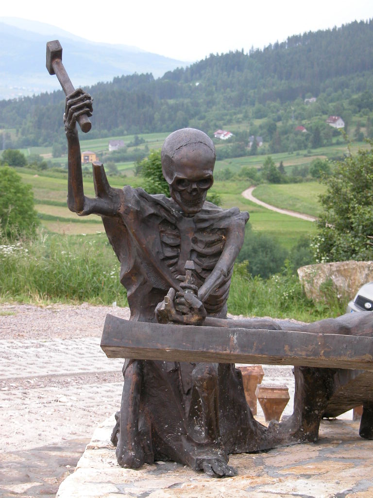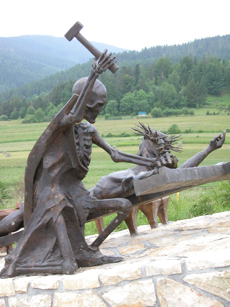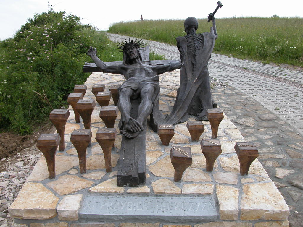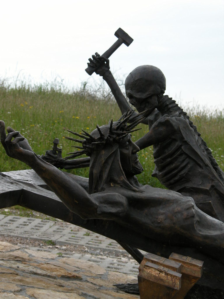 Jezus rozpięty na krzyżu a Śmierć kończy dzieło Ukrzyżowania, scenę tę znamy wszyscy a jednak i tym razem prof. Czesław Dźwigaj zaskakuje nas i poraża tak, że każdy milknie. Otóż obok rzeźb Chrystusa i Śmierci, rozsypane są gwoździe, pokaźnych rozmiarów na łebkach których są napisy: pycha, chciwość, zazdrość, nieczystość…